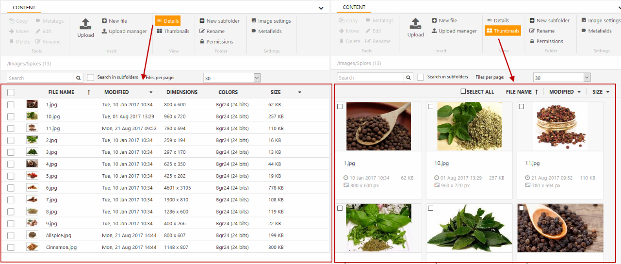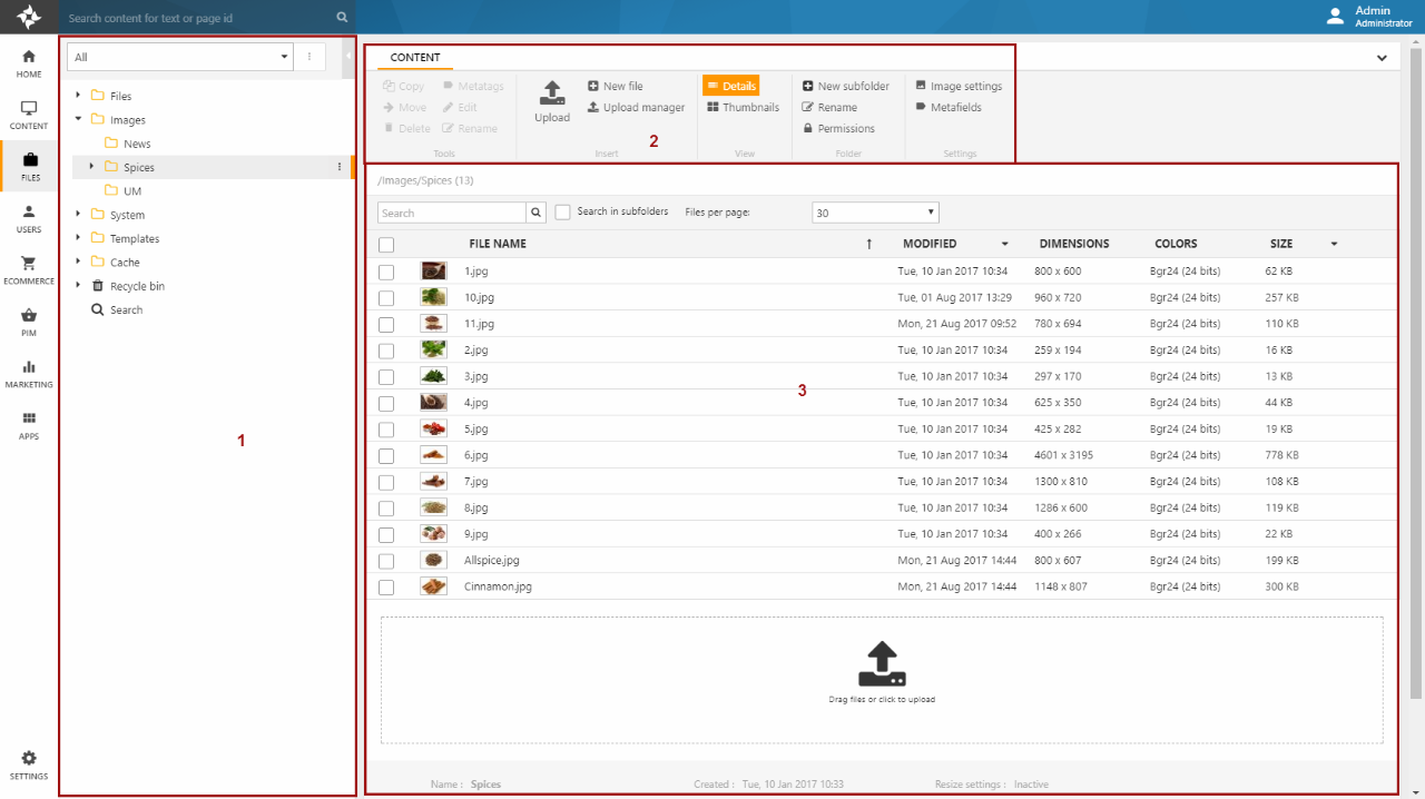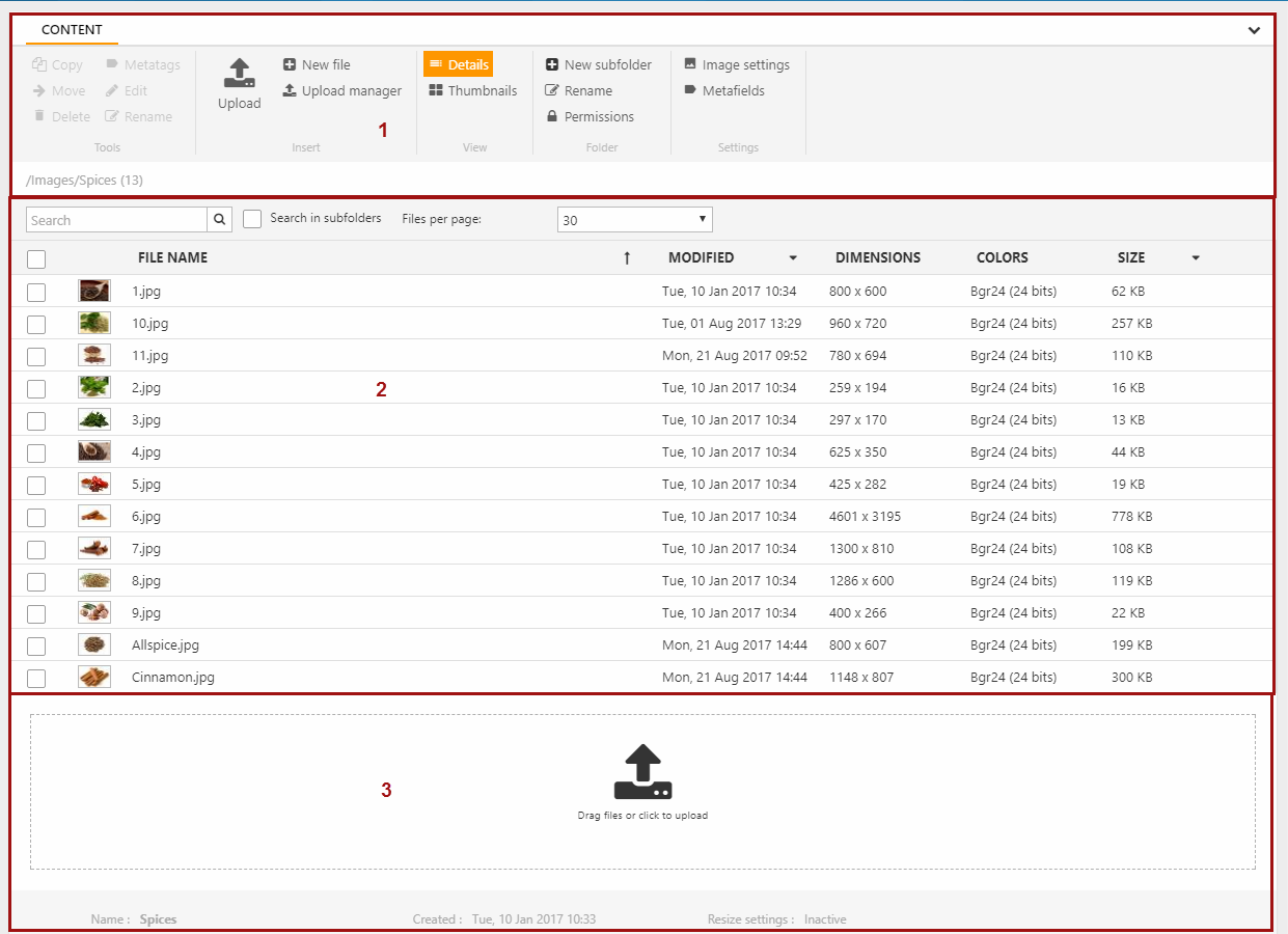 When you click on a folder in the folder tree, a list view of the folder content opens in the content pane (Figure 8.2). Broadly speaking, the content pane here consists of a file manager toolbar (1), a files list (2) with filtering at the top, and a file upload area (3).