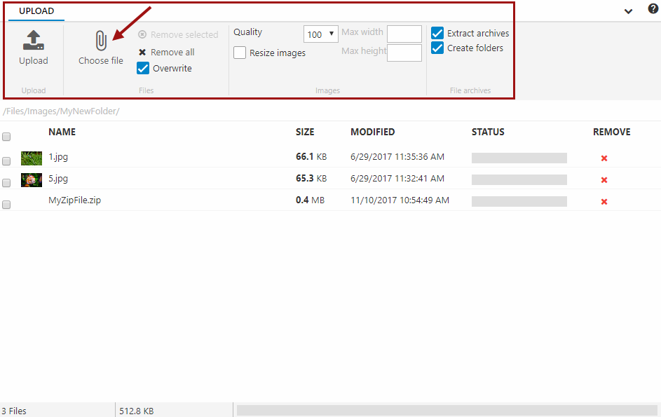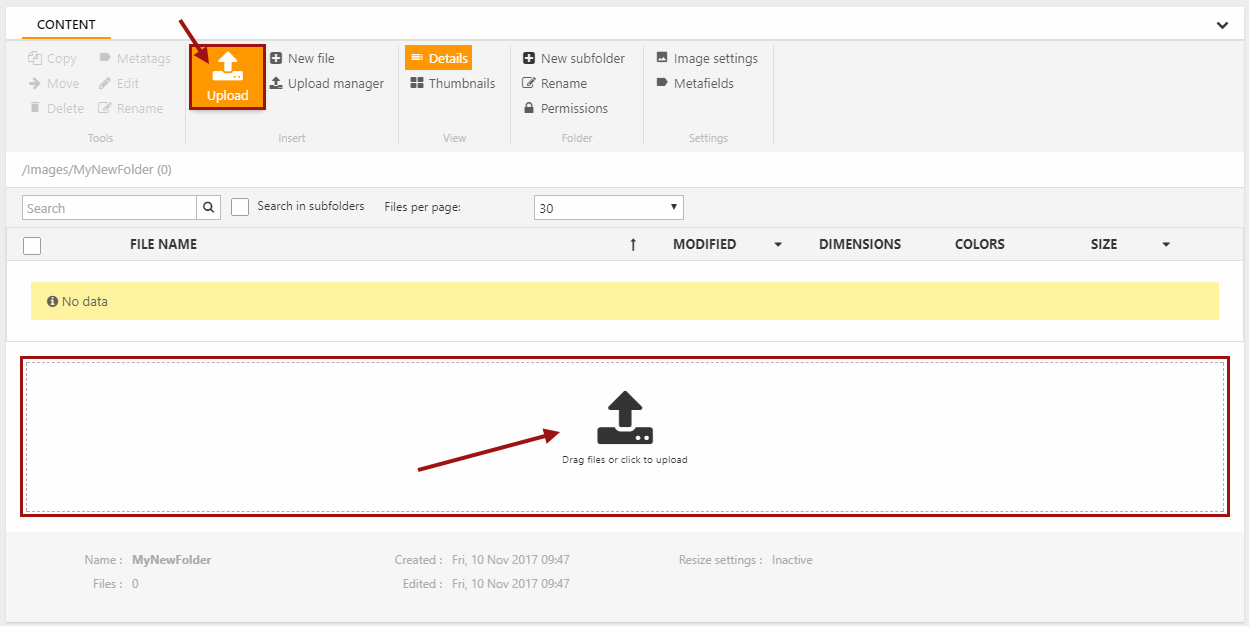 To upload a file, you can either click the Upload button in the file manager toolbar or drag and drop a number of files in the file upload area (Figure 10.1). Clicking any of the two buttons will open the usual file selector window on your computer.