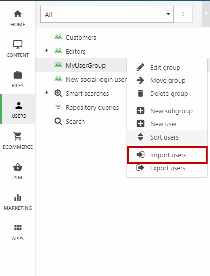 To import users from an Excel Worksheet file, click the menu button for a user group and click Import users (Figure 16.1).
