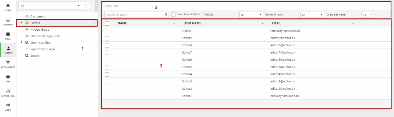 If you click a user group, the appropriate users will be shown in a user list (3) in the content pane with a User toolbar at the top (2).