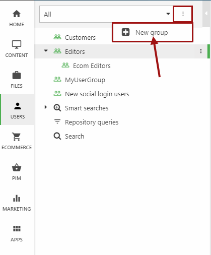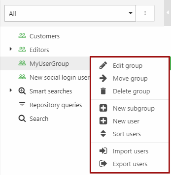 To create a new user group, open the User tree menu (Figure 13.1) and click New group.