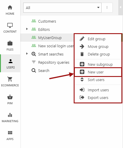 To create a user, click the menu button on a user group to open the context menu, when click New user (Figure 14.1).