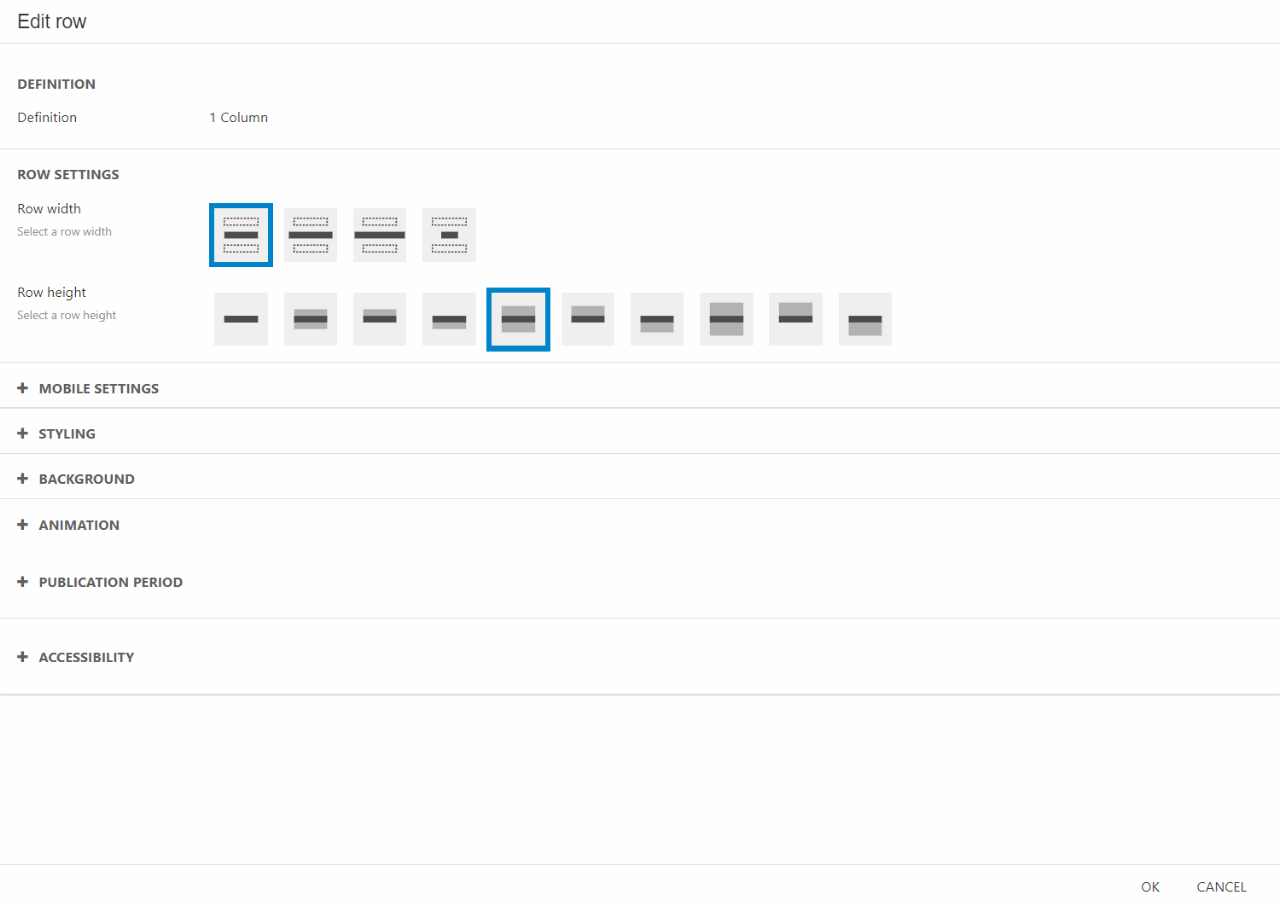 - Row width - This selects how wide you want each individual row to be. As the viewport can vary in width depending on the screen size (mobile vs. monitor) you have the option to configure the width of the breakpoints. This is done in the website settings as shown in this documentation.
