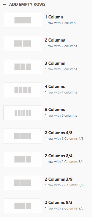 You can use rows to decide the amount and layout of the columns before content is added. Rows can consist of multiple columns depending on how you want your content to be showed. Below you can see which row types you can choose between, when you are about to place and structure your content.