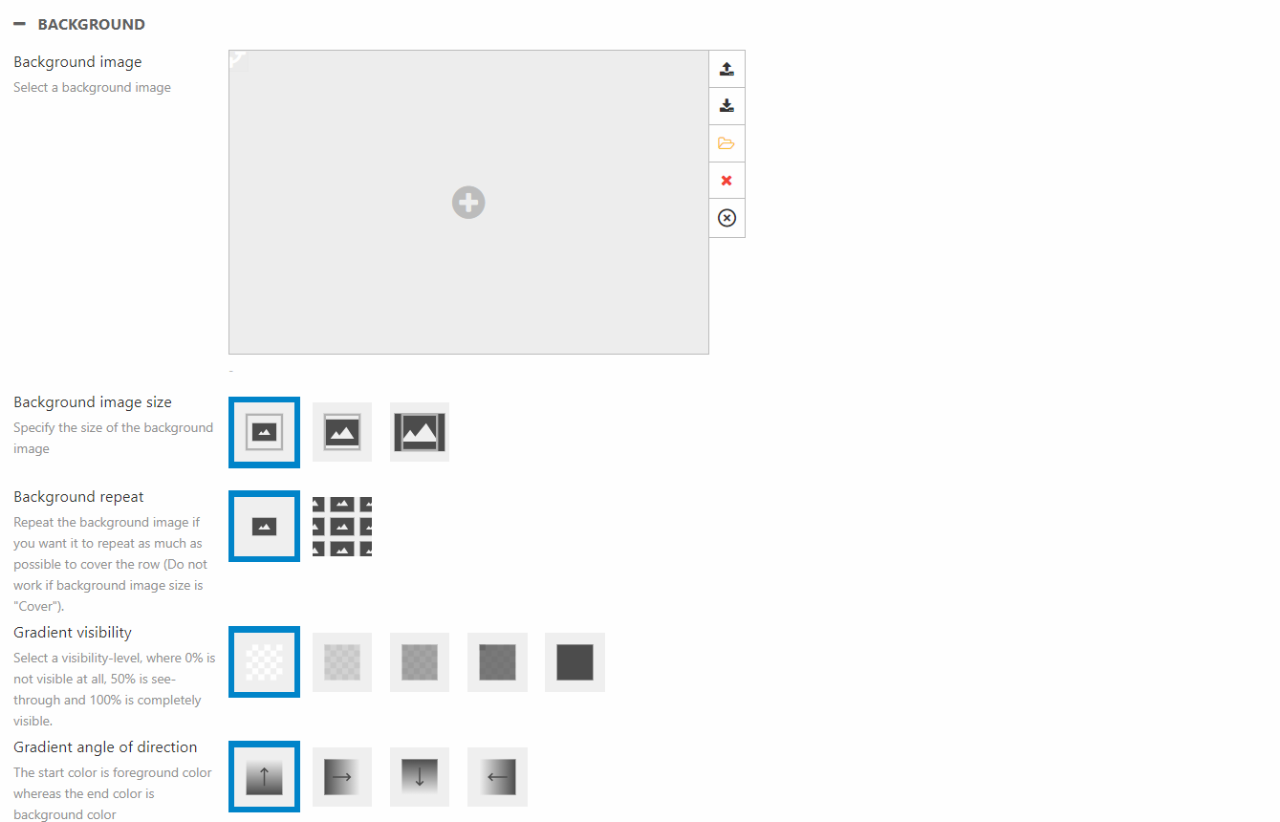 The row background section contains settings for background image and gradient for rows. This means that you can add an image, icon, or color as a background inside the row. You can still place whatever column you want on top of it.