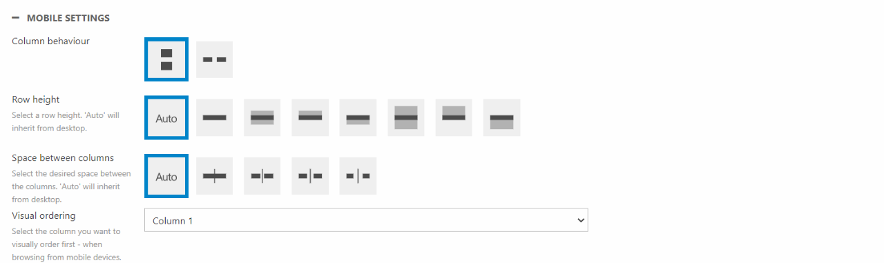 The Mobile settings section is for you to control how the row should behave when shown on smaller screens such as mobiles. These can either inherit behavior from the Row settings section or individually configured.