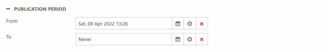 The publication period tool allows you to choose a From date and timestamp and a To date and timestamp. The tool has been explained in our Publication period documentation.