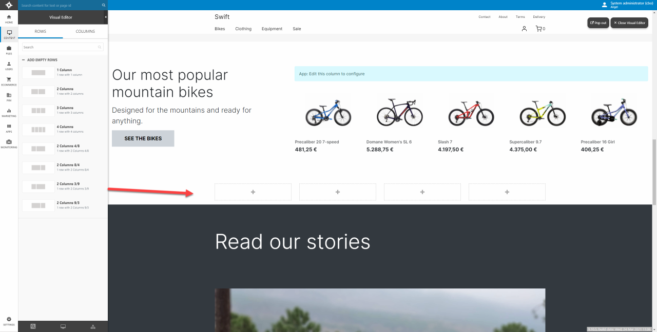 When you add a row to a page, it shows up in the visual editor with a placeholder for each column - here 4 columns (Figure 1.2). You can then drag & drop columns onto the placeholder to create content.