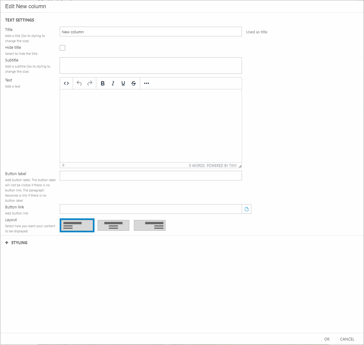 When you drop an empty column type onto a column slot you will be presented with a modal which contains the input fields and settings relevant for that particular type of content – for the column type Text this is a title, a subtitle, a text, a button label and a number of settings for controlling e.g. the layout and styling of the content block (Figure 2.2). When you click OK the content is immediately added to the visual editor view and you can see how it will look in frontend.