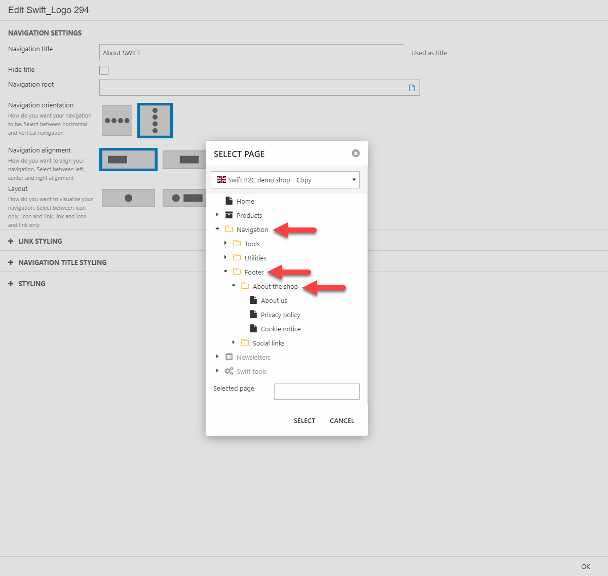 - Specify the navigation root. This can be selected with the small blue page icon to the right of the field. As you can see in (Figure 4.1), this website is organized into a navigation folder with subfolders containing the pages of the website. Select the folder in which the pages you want to navigate to are located - in this case "About the shop".