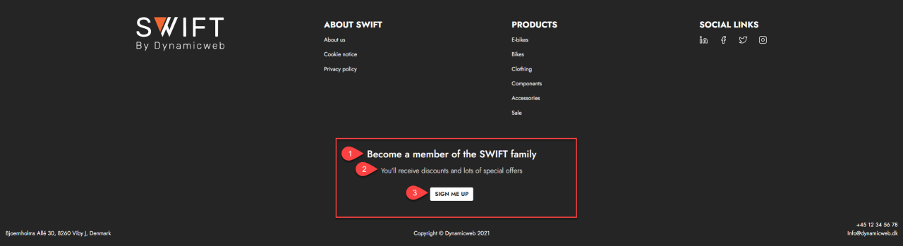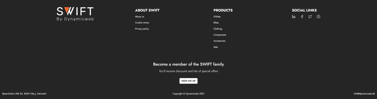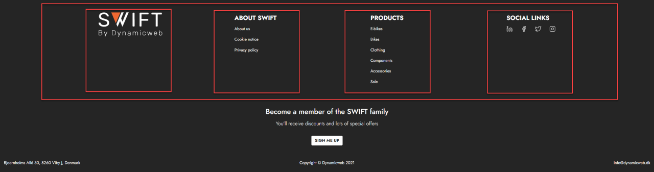 Having a well-structured and aesthetically pleasing footer can be crucial to the customer's experience of navigating a website. With Swift it does not have to be complicated to make one that covers your specific wishes.