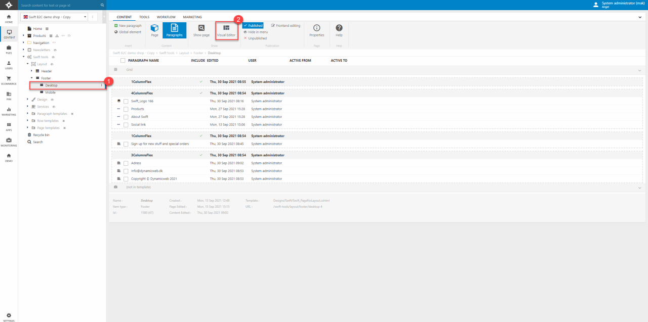 From here you can access the intuitive Visual Editor (2) to drag-and-drop content in the same manner as you would with the website's general content. In this example we’ll start from scratch with an empty footer to show the different features of the Swift Visual Editor.
