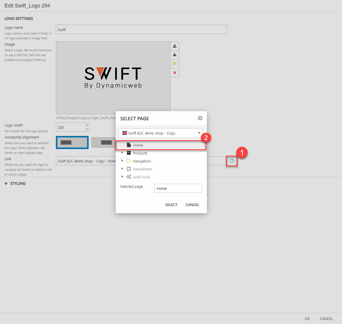 - Make the logo link to your landing page (Figure 3.2). This is done by clicking the small blue page icon (1) which will open a small menu. Click your landing page (2) and hit SELECT.