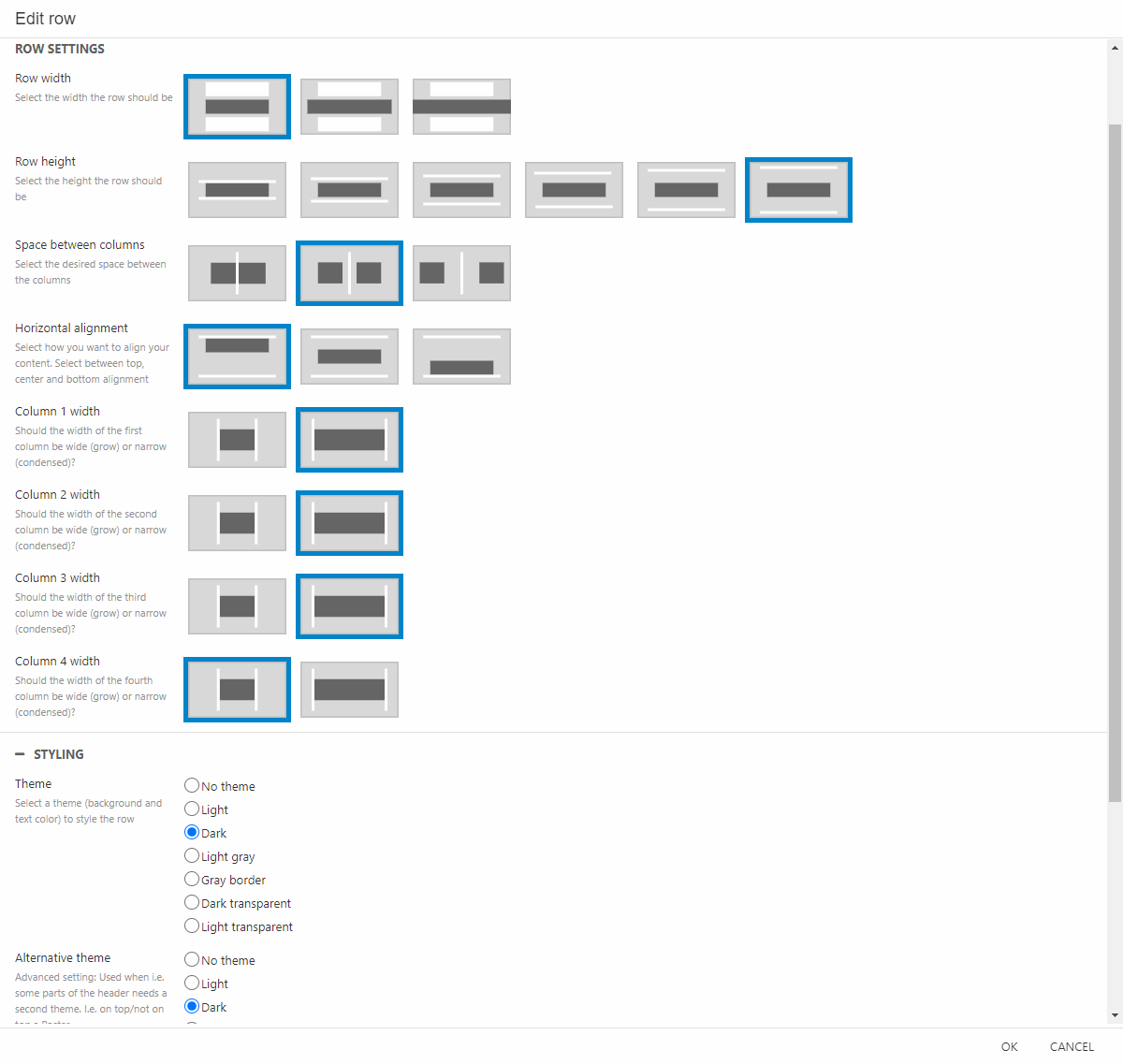 The last thing we’ll do with this row is changing the theme to dark and adding some air above and beneath the row content. This is done in the row editor, just like we did with the other row.