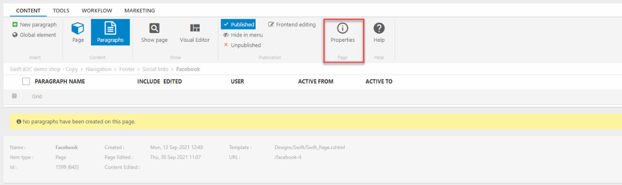 The most important thing to change when working with social media links is what they are linking to. This is done by closing the Visual Editor. In the backend content section navigate to the desired page (Navigation > Footer > Social links > Facebook). The pages should be empty, instead they’ll redirect the user to your different social media channels. Right now, it’ll either redirect to nothing or to Dynamicweb’s Facebook page. To change this, do the following steps.