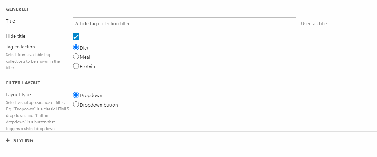 The article tag collection filter is often used when users want to sort articles in an article list column by their tags. It allows you to specify which tag collection they can choose tags from. In the example below (Figure 11.1) it is a 3-column row containing three article tag collection filter columns, that way they can choose from all tags in the three tag collections “Diet”, “Meal”, and “Protein”. If you want to choose exactly which tags, even across tag collections, the user can choose from you should use the article tag filter instead.