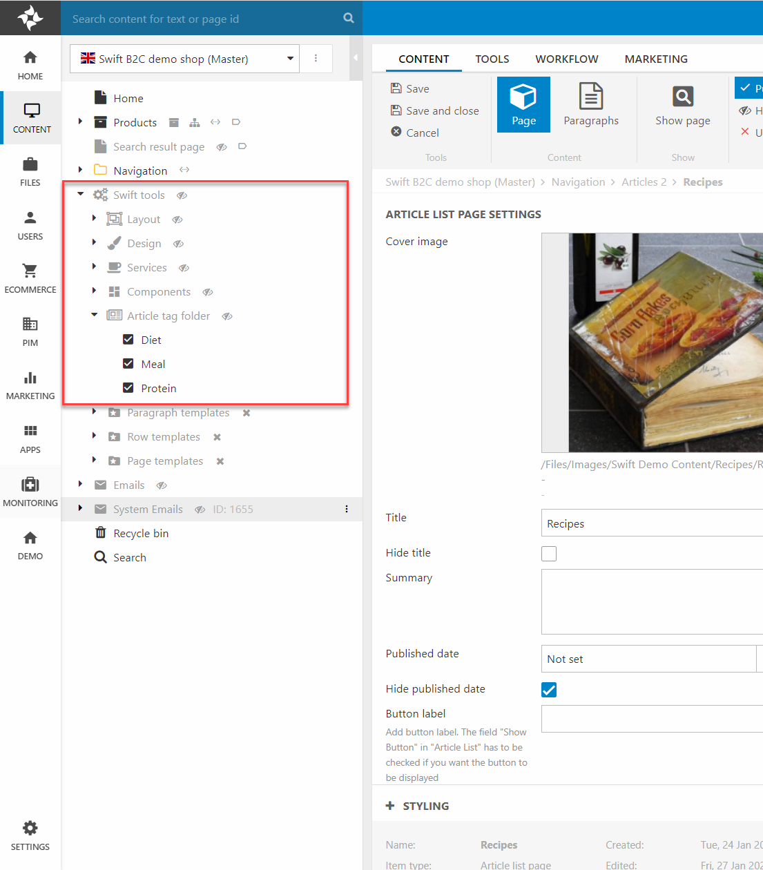 Tags needs to be created before they can be used on articles. In the default Swift demo site the tags are located in the “Swift tools” folder as shown on Figure 7.1. If we keep the cookbook example and we wanted to add a new tag in the tag collection called “Diet” we would first locate the tag collection.