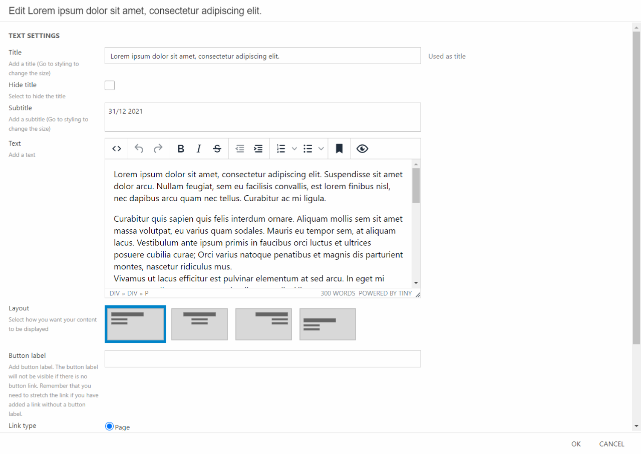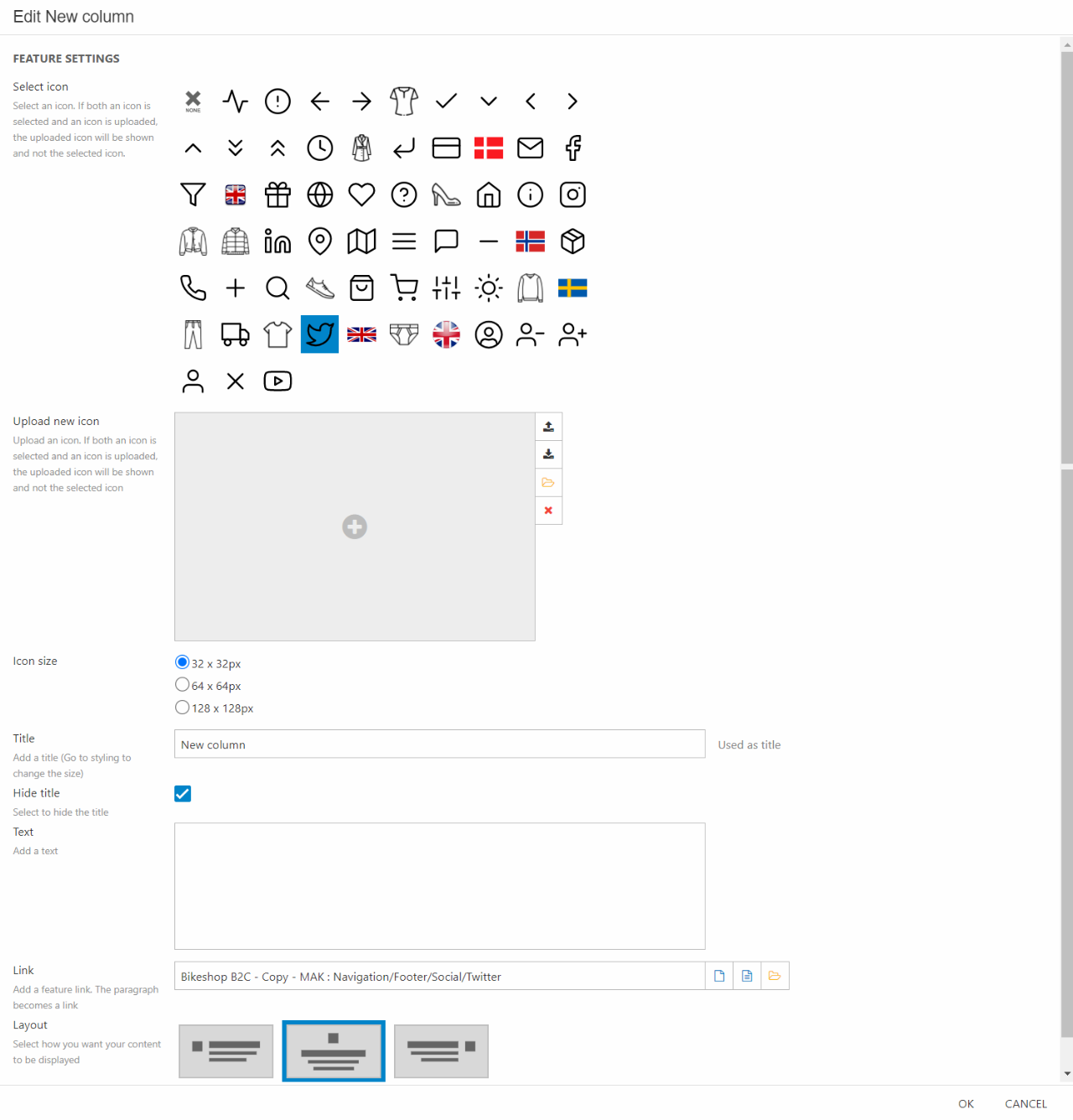 - Choose the layout of the column - We recommend using images with the aspect ratio of 32/9 as this is how the images are displayed