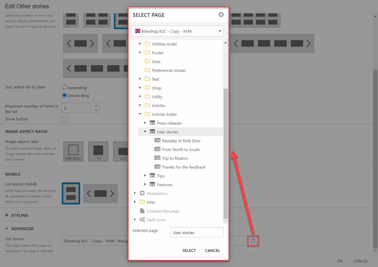 The most important thing to do when working with the article list column, is to choose what kind of articles you want displayed. This is done in the “Advanced” section. Locate the folder or article list page containing the stories you want displayed. In this case it’s the User stories article list page (Figure 15.1).