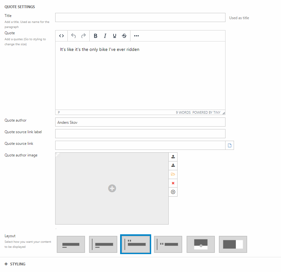 The last element on the page is an article list column accompanied by a section header. We’ve changed the theme on the last two rows, to make them stand out a bit. This is done in the styling section in the row editor.