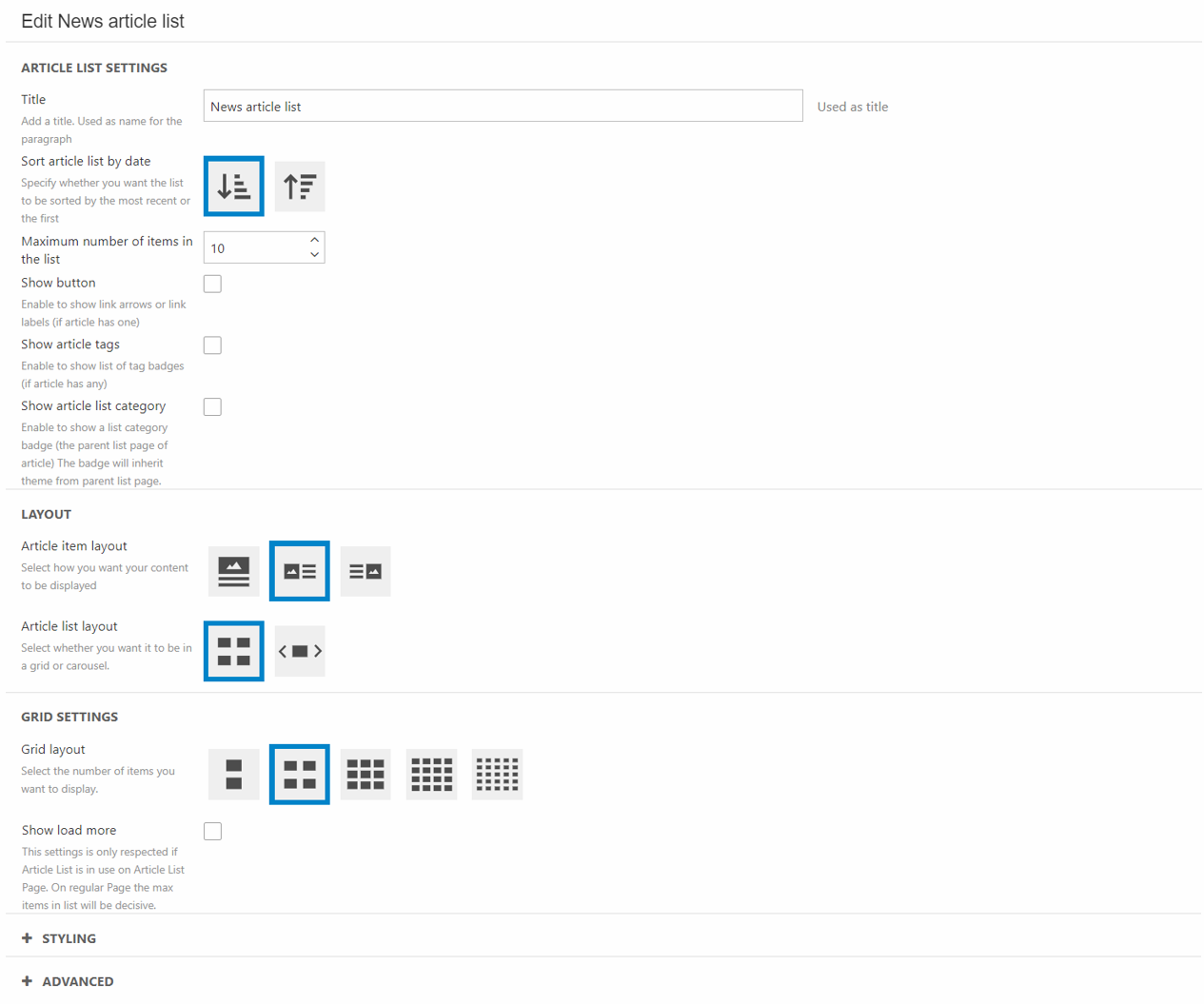 The most important thing to change in the column settings are in the advanced section. Here you’ll need to set a list source. This can either be the folder your article list pages are placed in or the article list page your articles are placed in.