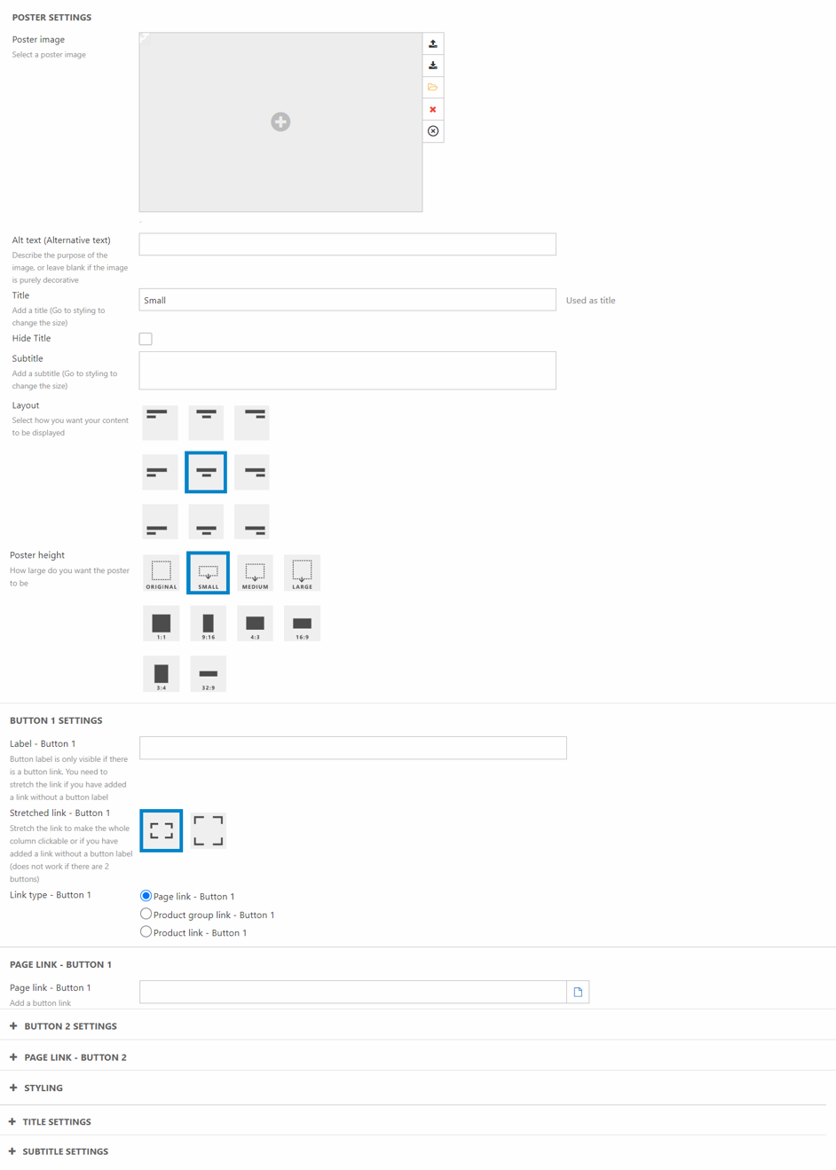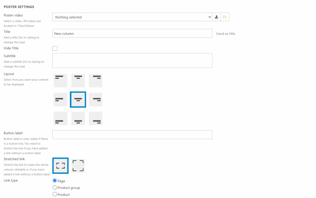 The Video Poster column (Figure 32.1) is often used at the top on the landing page. This way it will work as an eye-catching poster, that will keep the customers on the page. It can also be used to guide customers to new products or campaigns shown in the video. The video displayed in a Video Poster column will be looped - keep this in mind when choosing what to display.