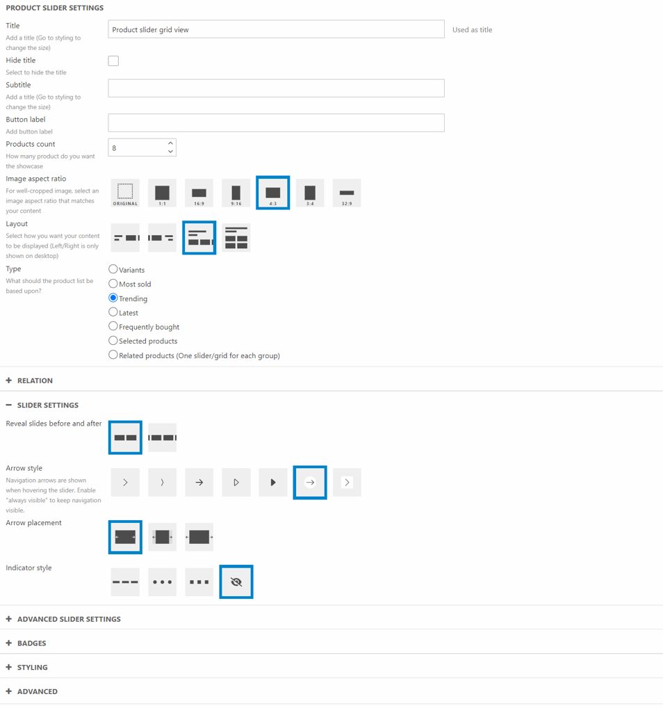 - Depending on the choice on the layout of the list (grid or slider) a specific settings section will show. In this case the Grid settings.