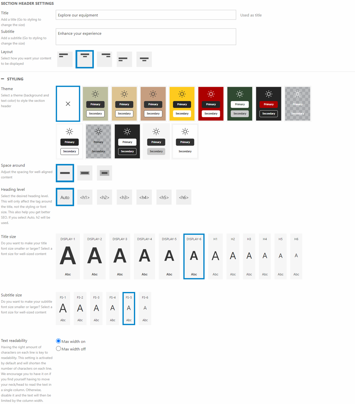 - Choose the heading level of the tag around the title. This will help on your SEO. You can read more about this in our SEO documentation.