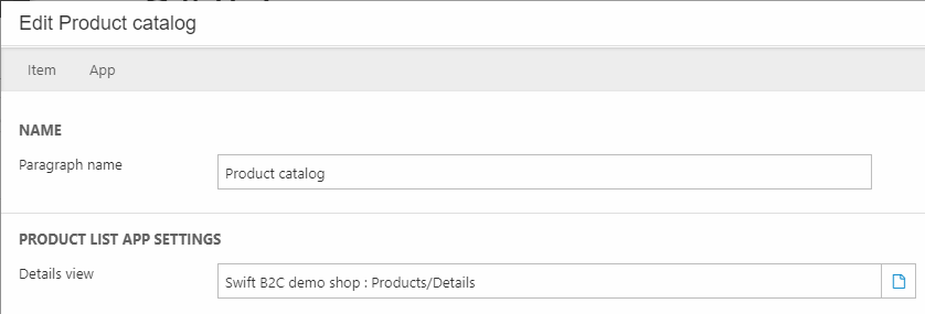 On the app tab you will find a Product Catalog for ViewModel attached – this app is used to expose the ProductListViewModel to the other paragraphs on a product details page. Nothing is rendered in frontend when this app is added to a page – but it is essential none the less. Read about how to add this app manually in the product list article.