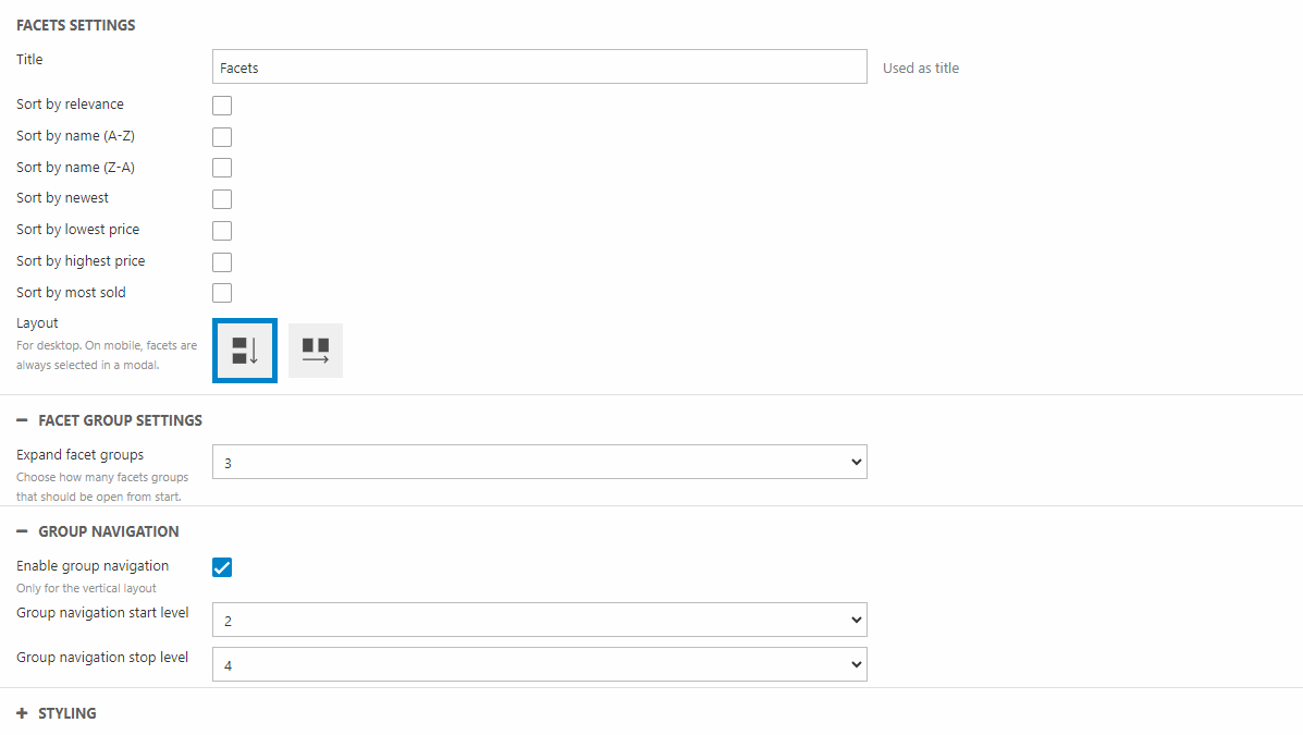 • Enable group navigation - this adds a group navigation to the facet column, which is useful if the top navigation is configured to not include product groups.
