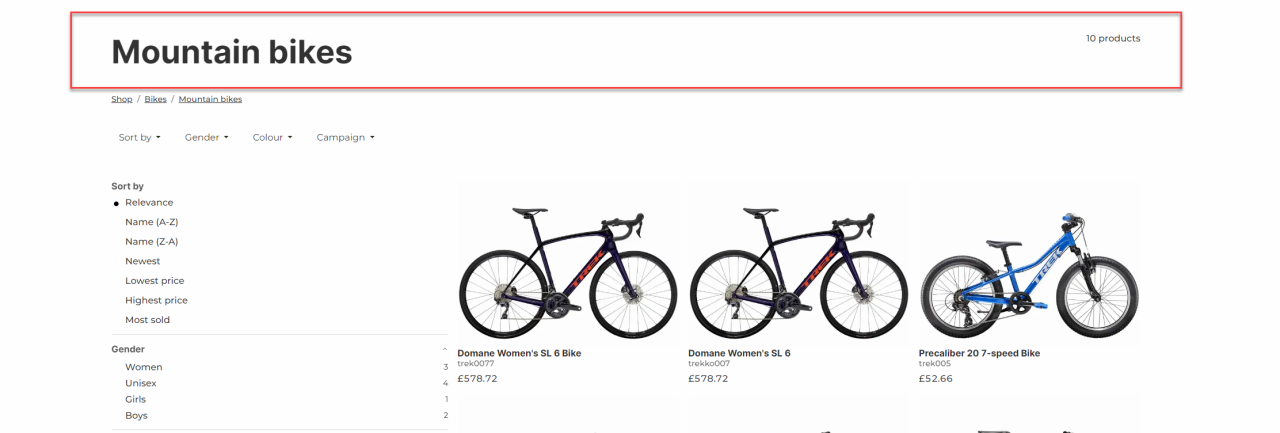 The product list header column is used to add a dynamic header to a product list page – in this case dynamic means that it will show: