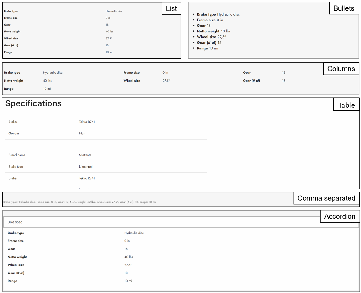 • List, Columns, Table, Bullets, Comma separated, and Accordion