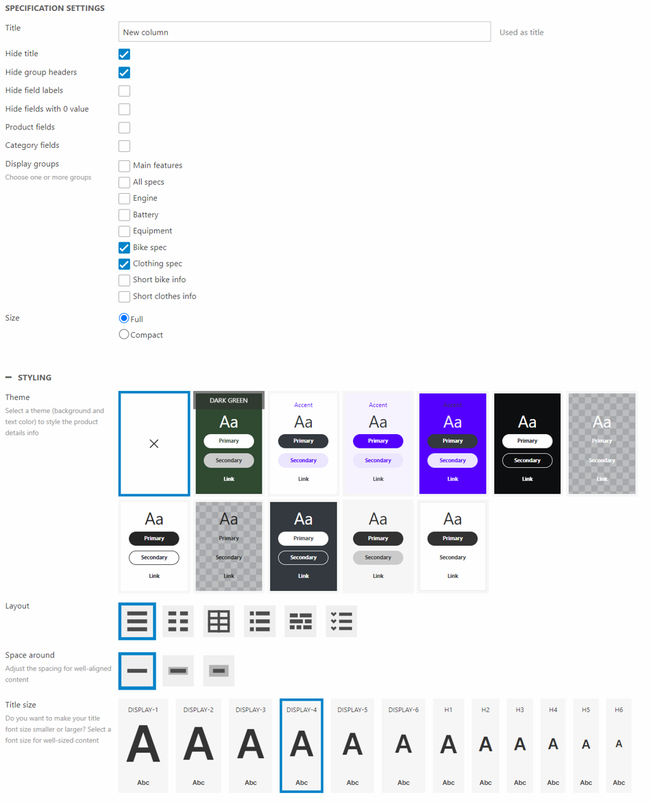 For layout you can choose themes for the column in general, the individual product, and the modal. You can also set the space around the column.