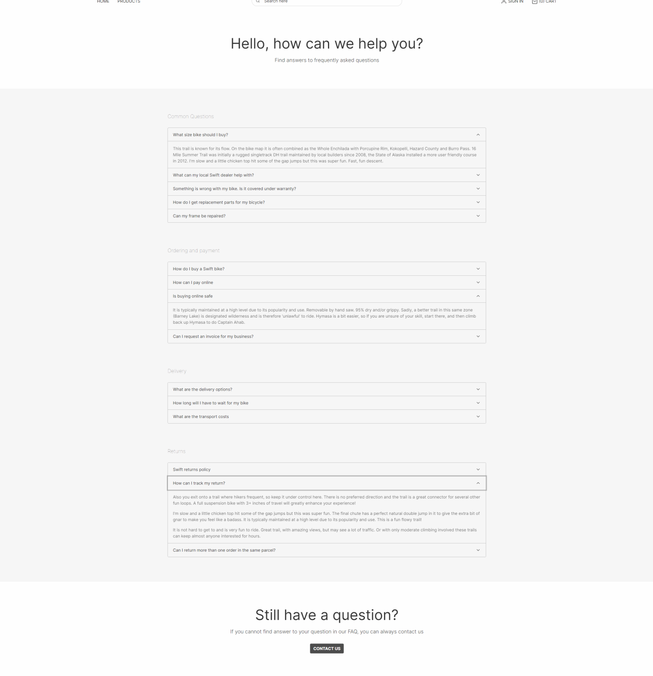 At the bottom we’ve made a button which will guide the customer to the contact page. This is for questions not answered by the accordions.