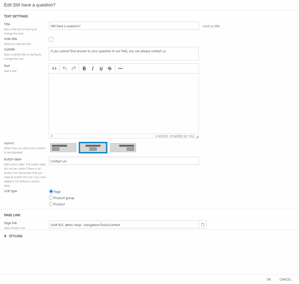 - Set the link type to Page and link to the appropriate page
