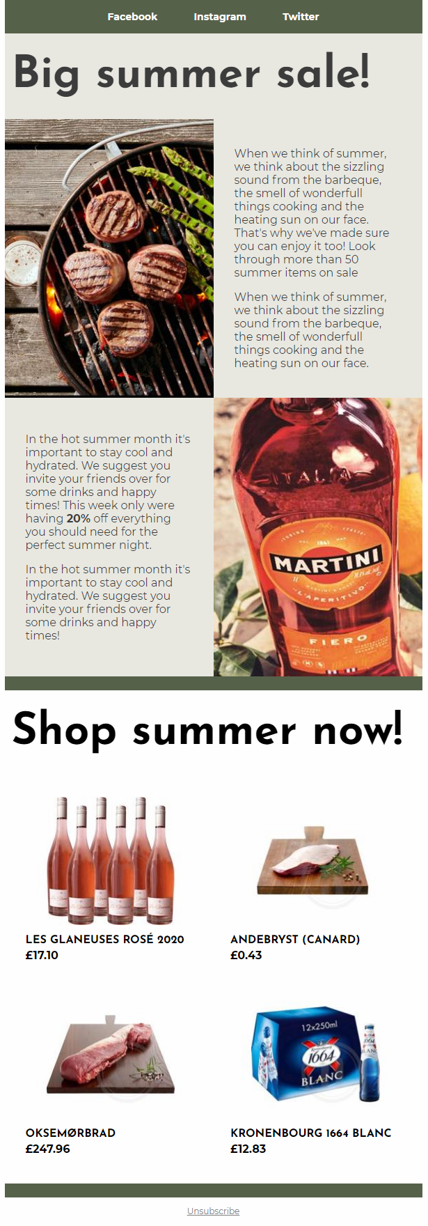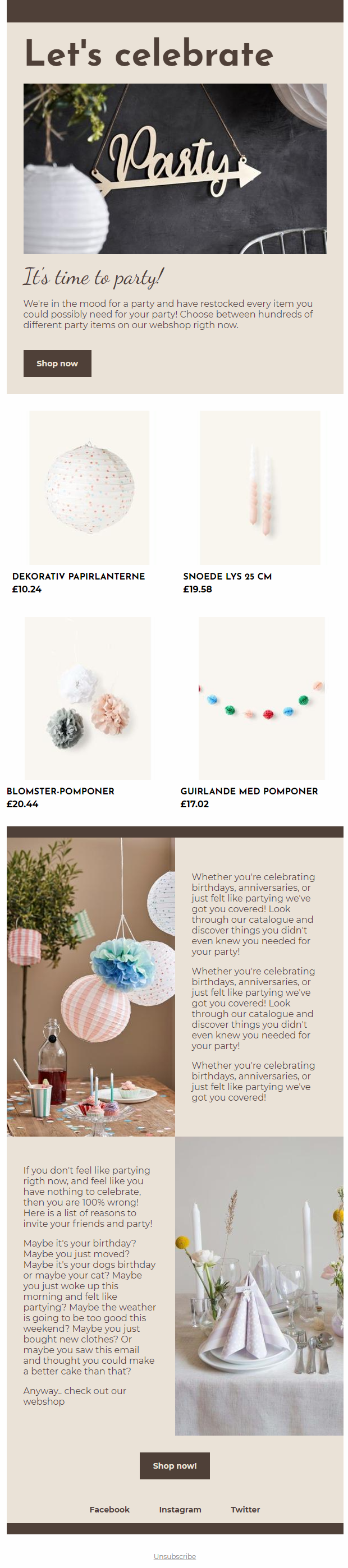 Newsletters are often used to inform customers about upcoming event. In this example the company has an upcoming sale and want to both inspire the customer and display items on sale.