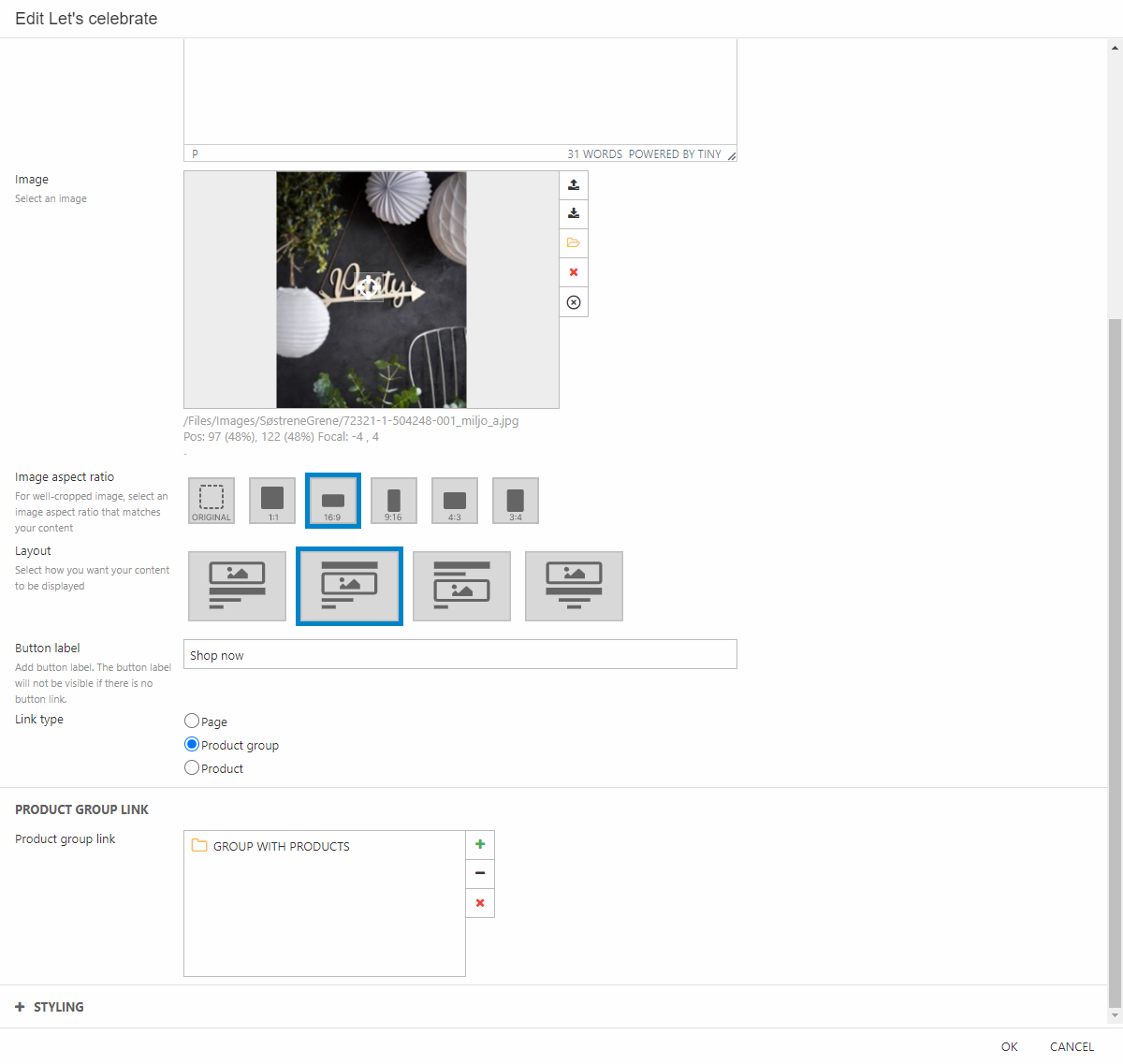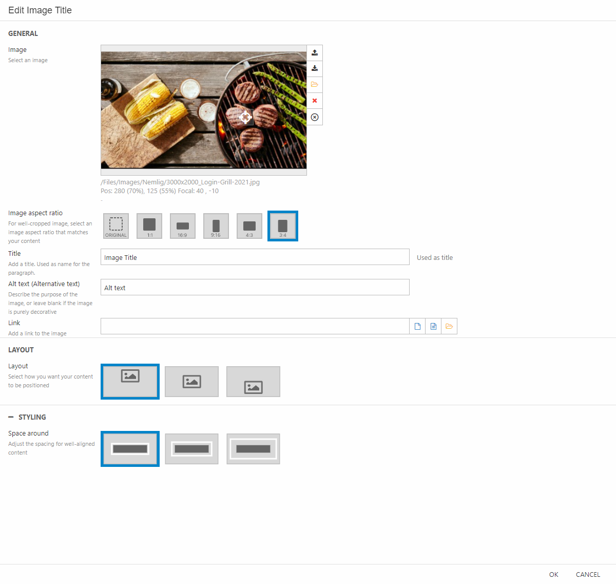 - Choose an image, set the focal point, set the image aspect ratio to 3:4. In the Styling section, make sure to have no space around. (Figure 11.1)