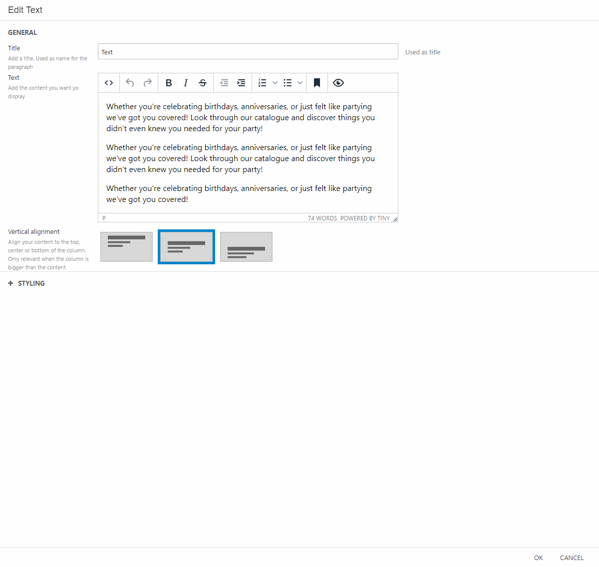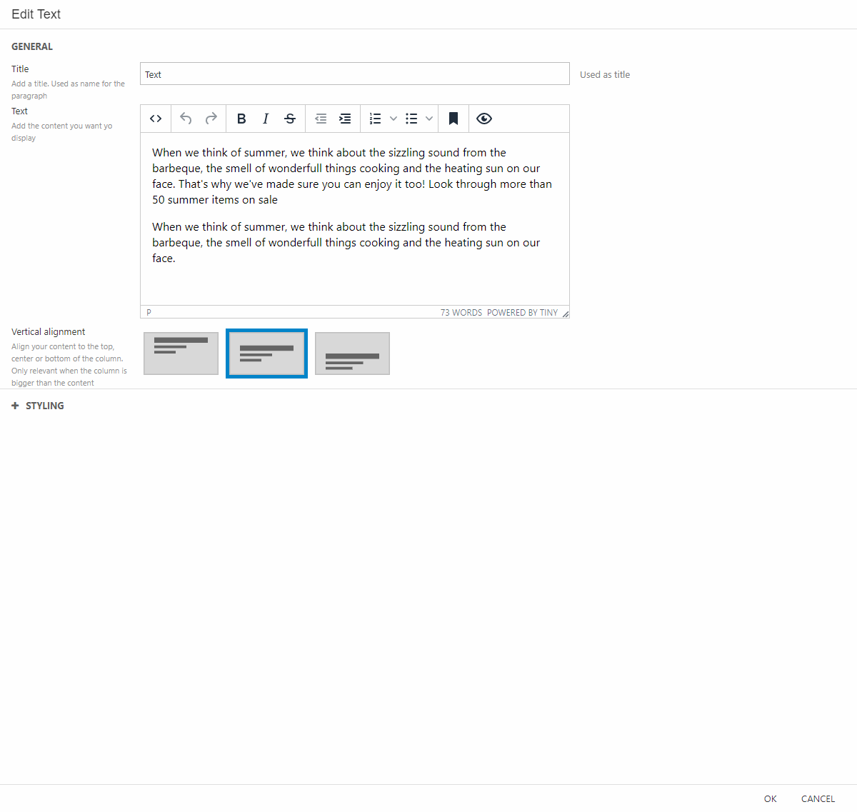 - Write your text in the text area of the settings and make the vertical alignment centered.