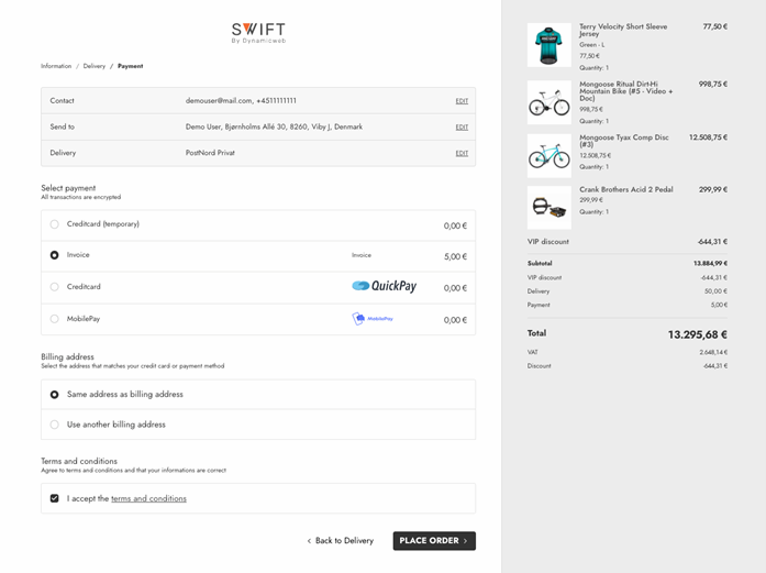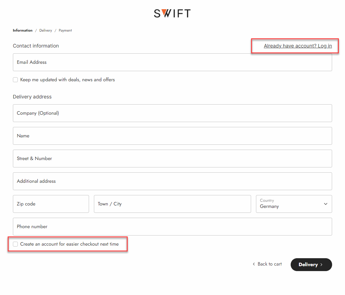 Swift ships with a checkout design which guides the customers through their purchase - it consists of the following: