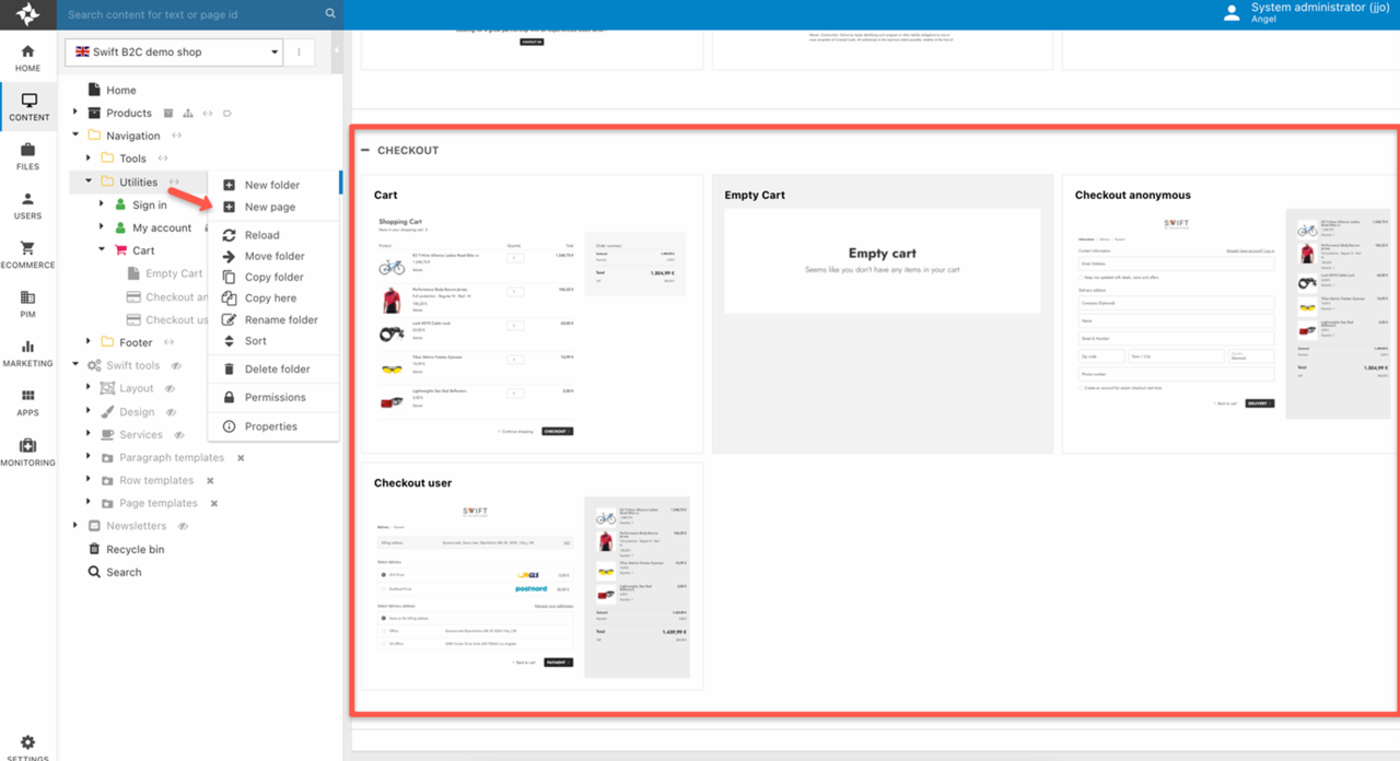 - Under the Checkout section select the Cart page preset – this preset contains a preconfigured shopping cart app amongst other things