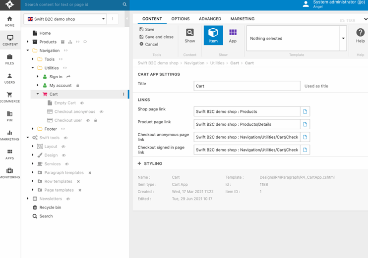 - On the Cart-app paragraph open the item-settings and add the appropriate links (Figure 3.1):