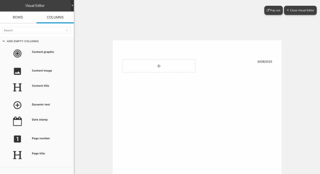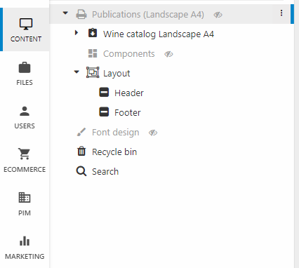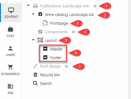 The layout folder is where you place the header and footer of the catalog. Headers and footers are often small watermarks that will create a connection between the different pages. This could also be page numbers. As you often want to keep the design of headers and footers relatively simple, you only have a few options in terms of content columns: Content Image, Content title, Date stamp, Page number and Page title.