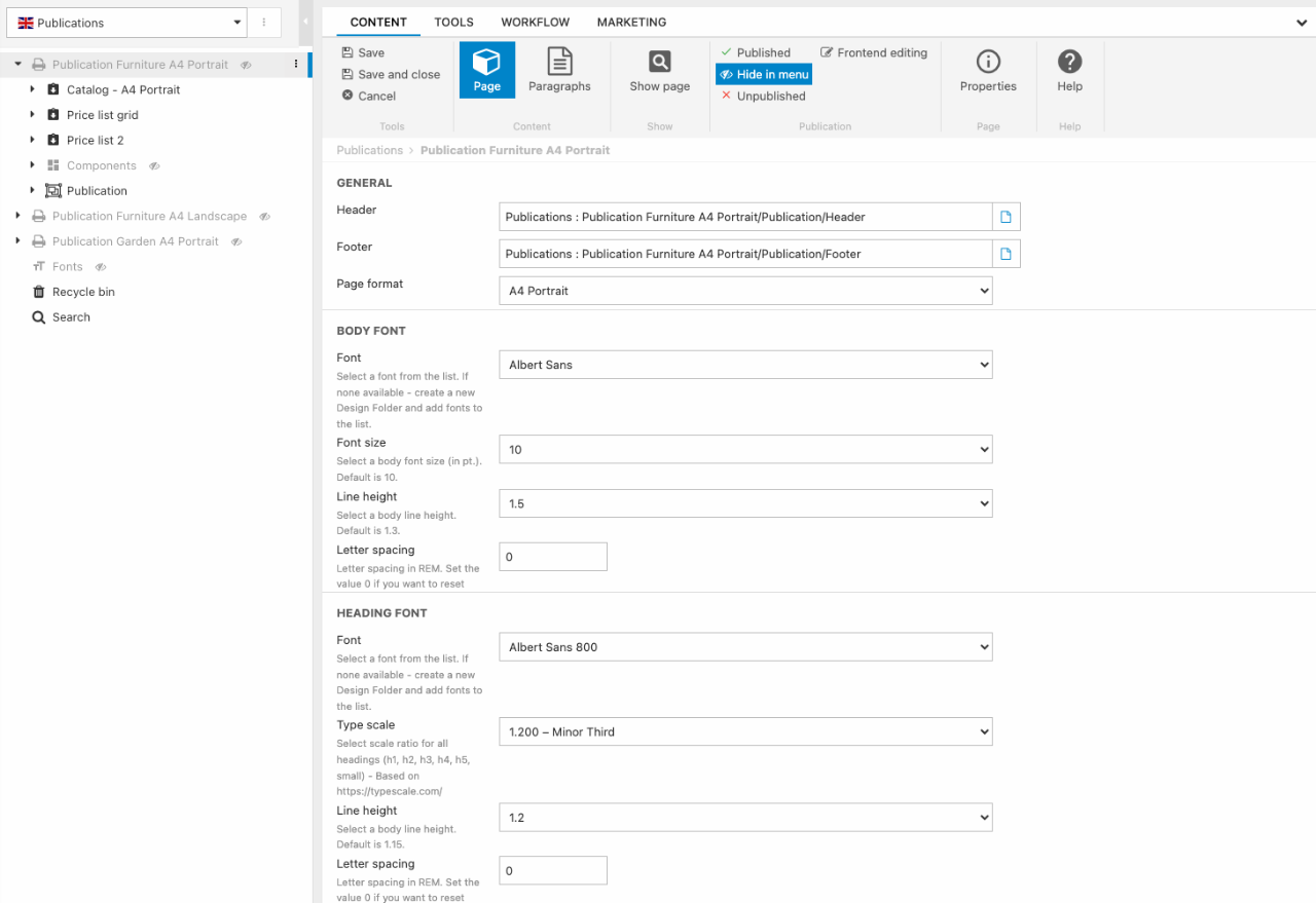 The publication folders holds information about the page format, heading and body font and typescale settings. This is also where you design and link the header and footer. This way all pages in the catalog placed in this publication folder will have the same header and footer.